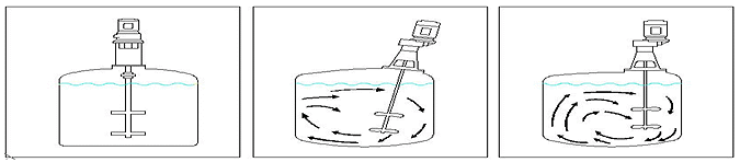 在大型之儲槽中是防止打旋的方法之一,將攪拌器插置於槽之側邊(圖F),其中攪拌器應與桶徑方向保有一個夾角。保留7°<β°<10°間,此方式可產(chǎn)生良好之流態(tài),若夾角不正確,則會發(fā)生混合不良現(xiàn)象。由於桶槽內(nèi)液體產(chǎn)生強大壓力,此安裝方式必須裝置軸封防漏,選用時必須考慮成本問題。