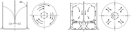 A. 中心插浸在低黏度且無擋板阻流之操作時,液體會產(chǎn)生打旋現(xiàn)象(圖D),攪拌速度越快則打旋越強烈,此種混合效率最低,通常系加裝擋板加以消除(圖E),在直立槽內(nèi)加裝四個直立標準擋板組,板寬約槽直徑之1/10~1/12左右,由於進一步增加板寬時并未發(fā)現(xiàn)動力增加,故由輪葉動力消耗觀點看,此項寬度并不能視為標準之板寬,因為實驗證明發(fā)現(xiàn),板寬范圍有助於流體上下打混,并消除渦流現(xiàn)象。但是板數(shù)增加時,動力消耗增加。當液體黏度增加時,對擋板需求層度隨之降低,板寬隨之減小,擋板可與槽壁保留適度之空隙讓流體穿過,而不至於產(chǎn)生滯留現(xiàn)象,更高黏度之液體則可采用斜角度方式安裝。